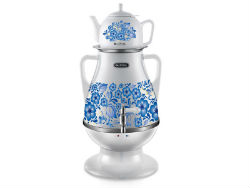 Электрический самовар совмещает в себе традиционные декоративные и современные функциональные элементы. Он состоит из металлического, фарфорового или пластикового сосуда, снабженного крышкой, ручками, краном для слива воды и подставкой. Внутри емкости помещается электрический нагревательный элемент трубчатого типа с поплавковым термовыключателем, который автоматически отключает прибор в том случае, когда уровень воды в нем ниже установленной минимальной отметки. Эта мера предосторожности является необходимым требованием пожарной безопасности. Прибор подключается к электросети посредством съемного шнура питания. Многие модели имеют функцию поддержания заданной температуры.